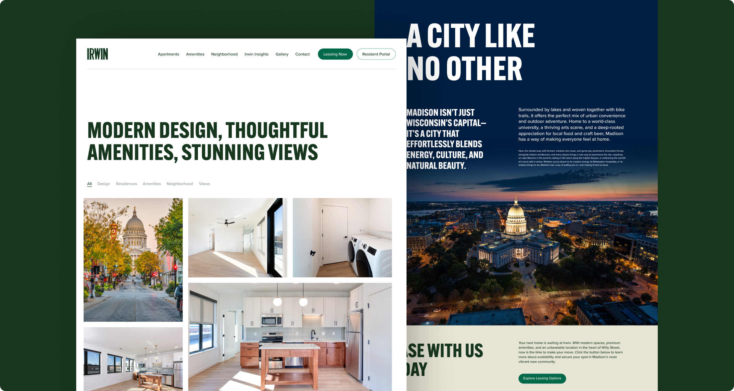 Nestled in one of Madison’s most eclectic, historic, and happening neighborhoods, Irwin is a brand new apartment building designed for those who crave city energy with a local touch. Thoughtfully crafted floor plans, modern amenities, and an unbeatable location make Irwin a perfect place to create a lifestyle that makes you happy and healthy.