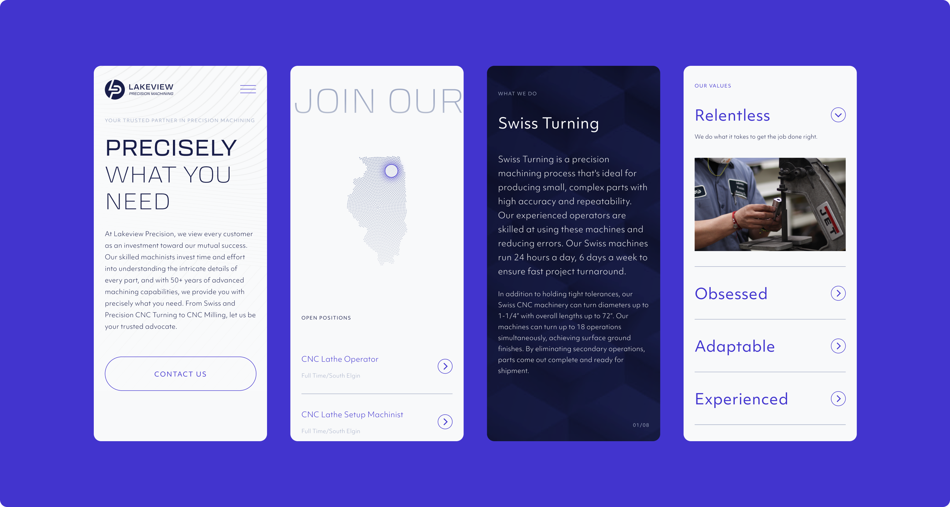 Lakeview is a precision CNC machining company that's dedicated to its people and committed to transforming the industry for the better. My team and I were chosen as their strategic partner to refine their visual identity and develop a new website, with the goal of positioning Lakeview as the innovative leader they truly are. As lead designer, it was my job to create a new logo, followed by a style guide which laid the foundation for the new website I designed.